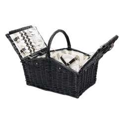 Panier à pique-nique RICHMOND PARK pour 4 personnes: couverts en acier inoxydable avec poignées en plastique incl., assiettes en céramique, verres à vin en plastique, 1 limonadier, salière et poivrier en acier inoxydable. Avec sangles de fixation à l´intérieur, doublure 100% lin, poignée extérieure de transport et fermeture tournante