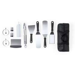 Incluye 11 accesorios esenciales: 1 espátula lisa, 2 espátulas con agujeros, 1 raspador, 1 juego de pinzas, 1 espátula, 1 salero, 1 pimentero, 1 dosificador y 2 moldes redondos.