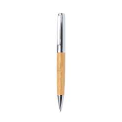 Descubre este elegante bolígrafo de bambú y metal. Su diseño cuenta con un cuerpo de metal resistente y un acabado brillante.