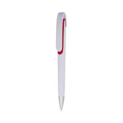 Bolígrafo con mecanismo de pulsador. Diseño audaz en tres colores. Atractivos detalles en tonos vibrantes y cuerpo blanco liso.