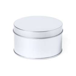 Caja de presentación circular. Fabricada en metal resistente, con un elegante acabado plateado y tapa a juego.