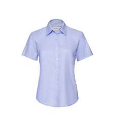 Camisa de oxford de manga corta para mujer, 70% algodón y 30% poliéster, con corte femenino y fácil de cuidar.