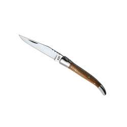El mango es de madera de olivo con un acabado nervado, que aporta elegancia y autenticidad. El sistema de resorte es guilloché, y cuenta con dos mitras de acero inoxidable forjado.