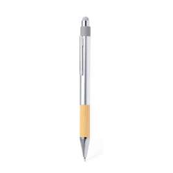 Elegante puntero en bambú y aluminio reciclado. Diseño robusto con un acabado mate. Suave agarre en bambú y puntero gris en la parte superior. Incluye clip metálico y mecanismo de botón retráctil.