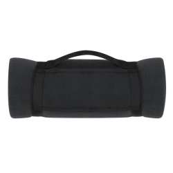 Manta polar de 130x160 cm, disponible en diversos colores, con tratamiento anti-bolitas y asa de transporte con cierre de velcro.