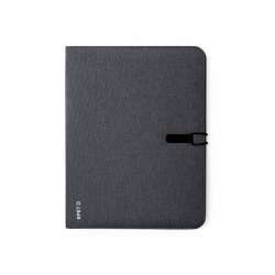 Dossier elegante de tamaño A4. Fabricado en resistente RPET 600D, ideal para quienes buscan calidad. Su diseño incluye detalles en negro y una cierre metálico con banda elástica.