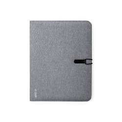 Dossier elegante de tamaño A4. Fabricado en resistente RPET 600D, ideal para quienes buscan calidad. Su diseño incluye detalles en negro y una cierre metálico con banda elástica.