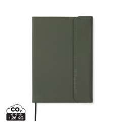 Su cubierta está fabricada en PU reciclado al 30% y cuenta con un cierre magnético. Incluye un práctico porta-lápices.