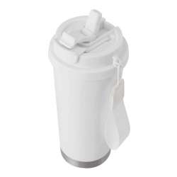 Tapa de plástico 2 en 1 a juego con tapón de rosca y junta de sellado de silicona. Abertura para beber compatible con pajita. Asa de RPET para un transporte fácil.