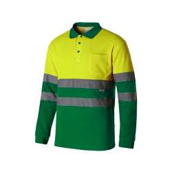 Descubre el polo bicolor de polialgodón de manga larga. Está diseñado con un cierre central de botones y bandas reflectantes en el pecho y las mangas. El cuello y los puños acanalados añaden un toque de elegancia.